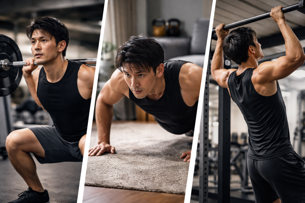 スクワット(下半身)、腕立て伏せ(胸・腕)、懸垂またはラットプル(背中)といった大きな筋肉を使う種目を中心に行うことで、初心者でも短期間で見た目の変化を感じやすくなります。