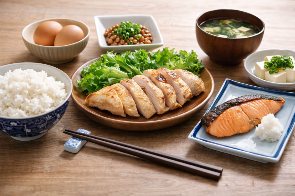 朝はご飯・卵・納豆、昼は鶏むね肉とご飯と野菜、夜は魚や肉と野菜を中心にし、間食としてヨーグルトやバナナを取り入れることで初心者でも無理なく栄養バランスを整えられます。